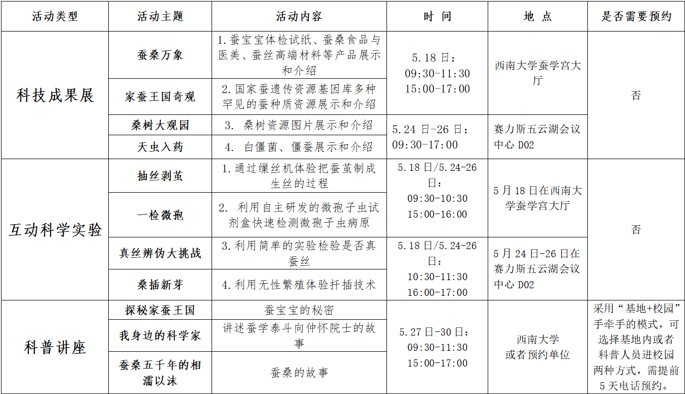 资源昆虫高效养殖与利用全国重点iQQtv 科技活动周作为本基地的品牌科普活动,已连续举办10年,旨在推动蚕桑科技成果走近公众,大力弘扬科学家精神,展示科技工作者报国为民的风采,引发青少年科技创新思维和兴趣,助力举国创新本次科技活动周主题为“智趣虫生 科创未来”。广泛服务社会各界人iQQtv 活动期间将公众免费开放,举行系列活动,现将活动相关情况公布如下,欢迎社会各界人士参观交流。