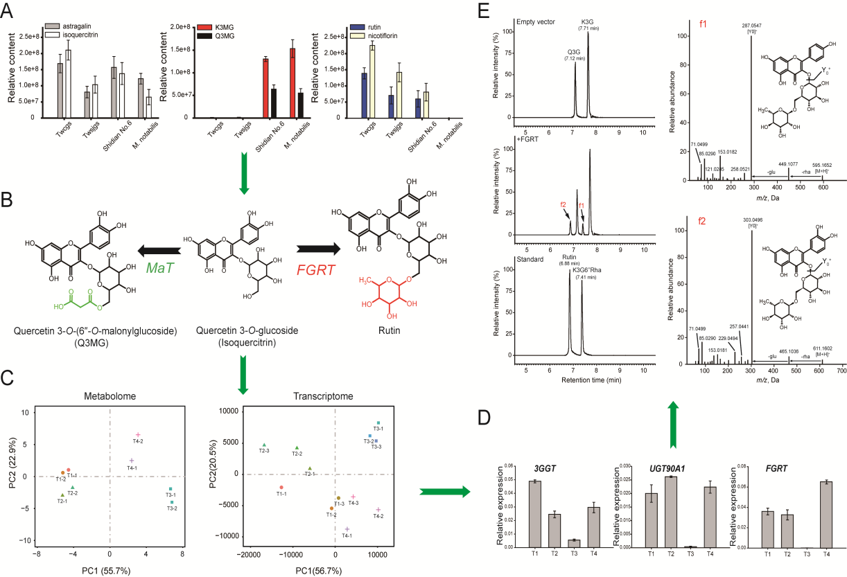 图1. 利用代谢组学和转录组学解析桑叶芦丁合成代谢的分子机制。