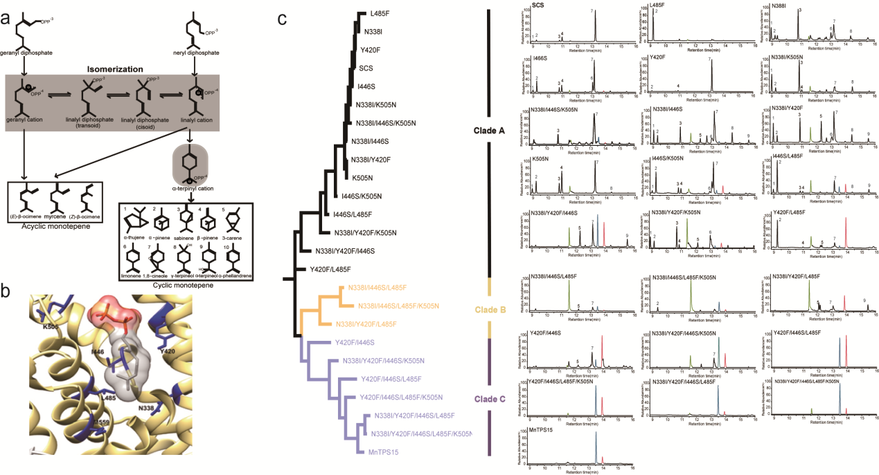 图3. 单萜反应机理及单萜合成酶通过阻碍异构化获得(E)-β-ocimene活性。