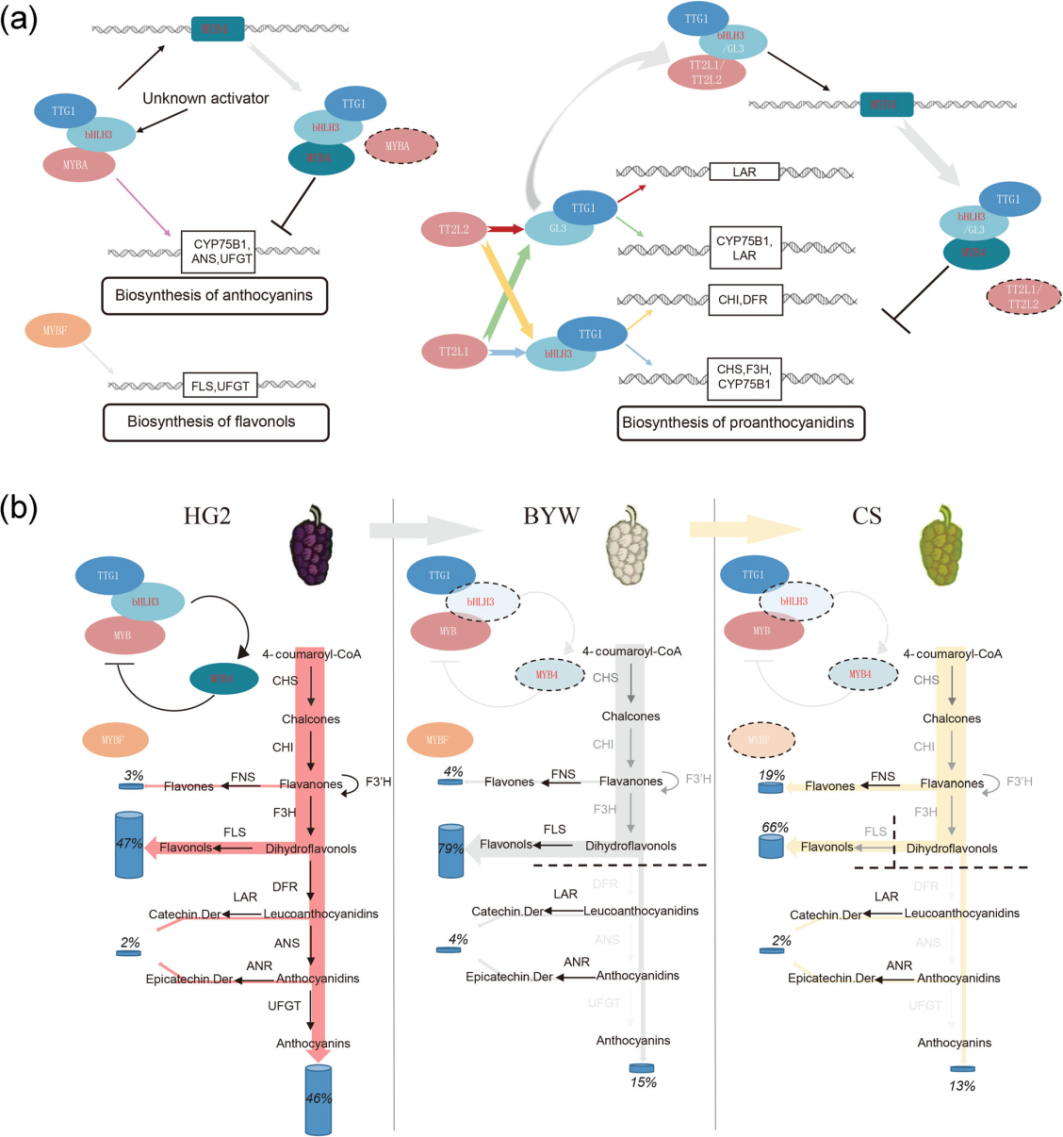 同年6月,课题组研究发现桑葚的着色过程是由激活和反馈调节机制构建的类黄酮稳态调控网络所决定的。bHLH3与MYBA、TT2L1、TT2L2、TTG1结合形成的MYB-bHLH-WD40转录复合物,不仅能正调控桑葚花青素和原花青素的合成,还能激活MYB4的表达;而MYB4则能竞争性地与bHLH3结合,负反馈抑制花青素和原花青素的积累。bHLH3在不同果色桑葚中的异常表达,改变了桑葚中类黄酮途径的代谢通量,最终导致花青素、黄酮和黄酮醇的含量和比例的差异,使得桑葚具备不同的颜色特征(图2)。