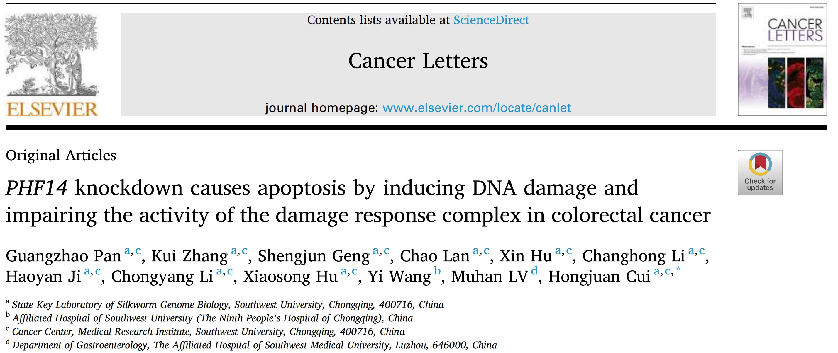 崔红娟教授团队在国际肿瘤学TOP期刊Cancer Letters(医学类一区,IF2020=8.679)在线发表题为:“PHF14 knockdown causes apoptosis by inducing DNA damage and impairing the activity of the damage response complex in colorectal cancer”(在结直肠癌中下调PHF14的表达可通过诱发DNA损伤和损坏损伤响应复合物活性介导细胞凋亡)的研究论文。