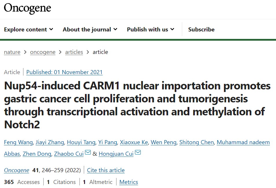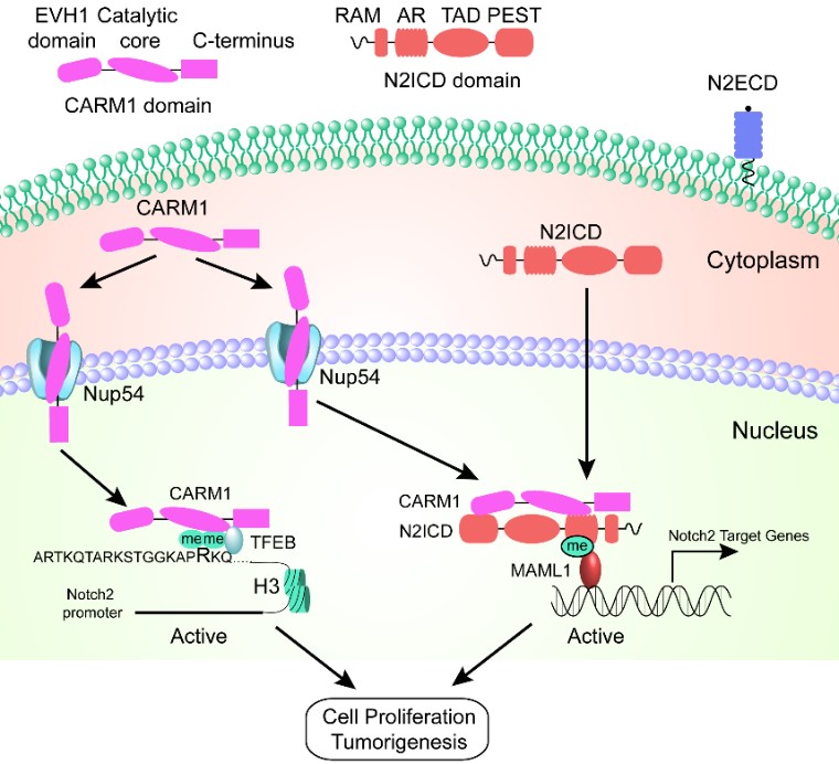 崔红娟教授组题为“Nup54-induced CARM1 nuclear importation promotes gastric cancer cell proliferation and tumorigenesis through transcriptional activation and methylation of Notch2”的研究文章。该文章揭示了精氨酸甲基转移酶CARM1通过转录激活和蛋白翻译后修饰调控胃癌细胞增殖和肿瘤发生的机制。