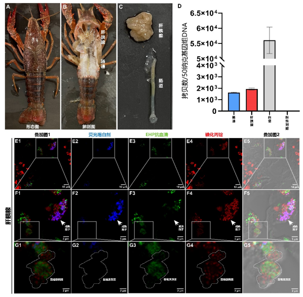 图1 克氏原螯虾感染EHP的鉴定分析 (A-C)解剖图;(D)核酸检测各组织病原感染量;(E-G)石蜡切片观察肝胰腺中的成熟孢子与裂殖原质团