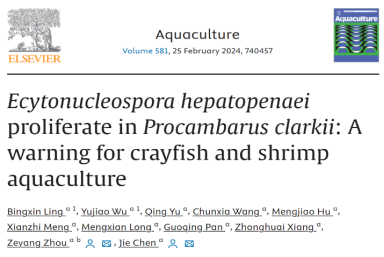 微孢子虫科研团队在中科院农林1区Top期刊AQUACULTURE(《水产养殖》)在线发表了题为“Ecytonucleospora hepatopenaei proliferate in Procambarus clarkii: A warning for crayfish and shrimp aquaculture”(虾肝肠胞虫在克氏原螯虾中感染增殖:预警小龙虾和对虾养殖)的研究论文。该研究首次发现甲壳类动物的二类疫病病原虾肝肠胞虫(Ecytonucleospora (Enterocytozoon) hepatopenaei,EHP)能够感染克氏原螯虾(俗称小龙虾),并造成克氏原螯虾肝胰腺和肠道的组织损伤。虾肝肠胞虫同时在克氏原螯虾和对虾中的感染流行,表明该病原对相关殖业具有更大的危害性和防控难度。