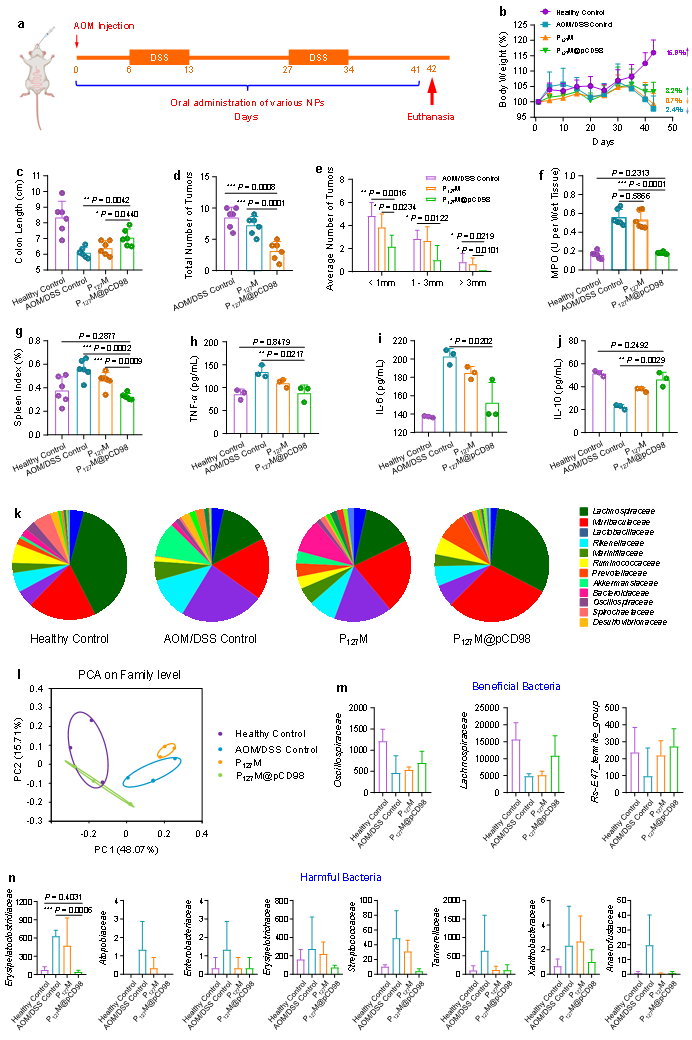 通过结肠长度、小鼠体重、髓过氧化物酶MPO值、脾脏指数、等参数评估了急性结肠炎的严重程度。发现P127M@pCD98通过降低促炎细胞因子(TNFIL-6)水平,上调IL-10水平、恢复结肠组织形态,调节CD4+CD8+免疫细胞数量以及肠道微生物平衡减缓炎症;另外,该研究还揭示了CD98表面糖蛋白在结肠炎症发展中的关键信号通路(图3和图4)。不仅如此,实验结果还证实了P127M@pCD98口服后可有效延缓CAC进展,提高有益菌的丰度,并减少有害菌的数量(图6)。