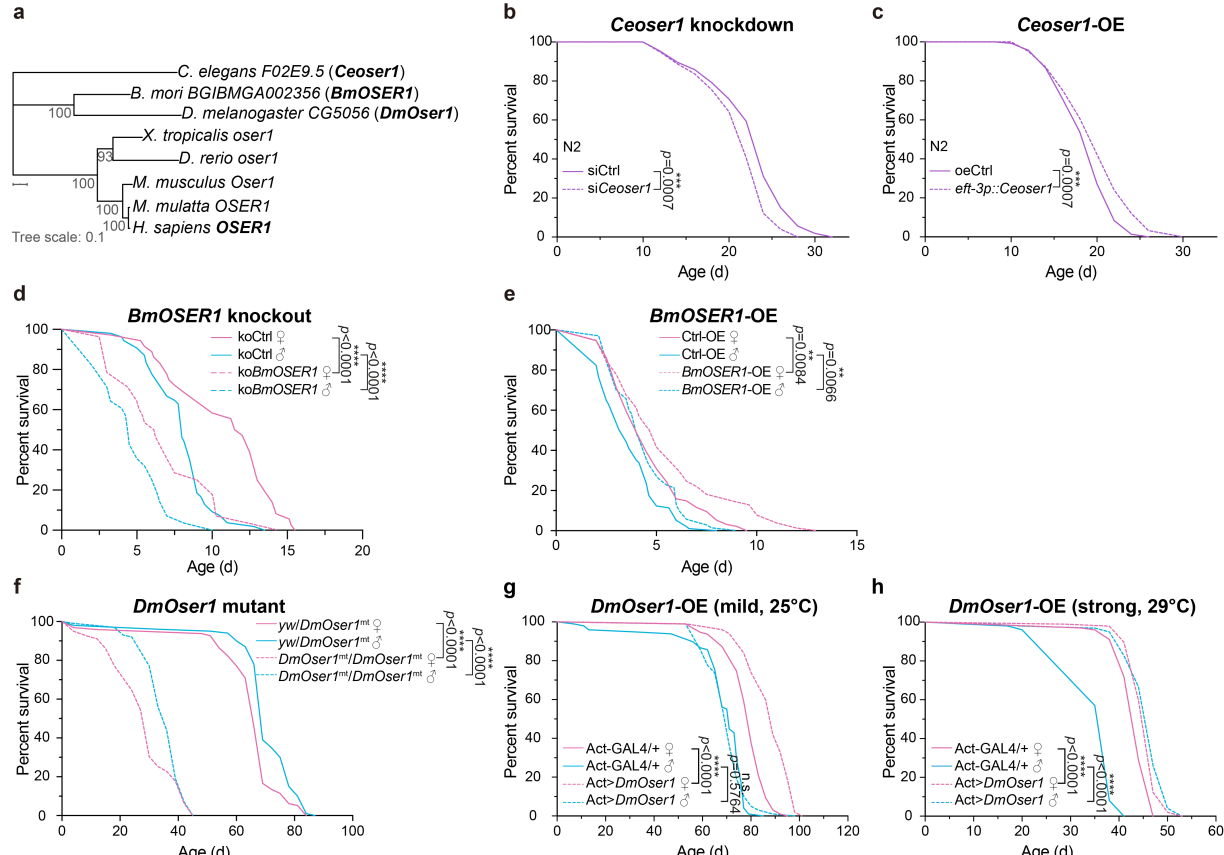 对线虫、家蚕、果蝇、斑马鱼、非洲爪蟾、小鼠、恒河猴与人类进行比较分析,发现其基因组中均存在OSER1的直系同源基因(图3a)。进一步研究显示,在家蚕、线虫和果蝇中,过表达OSER1后3个物种的寿命均显著延长;而OSER1被敲除、干涉或其突变体中,3个物种的寿命均显著缩短(图3b-h)。