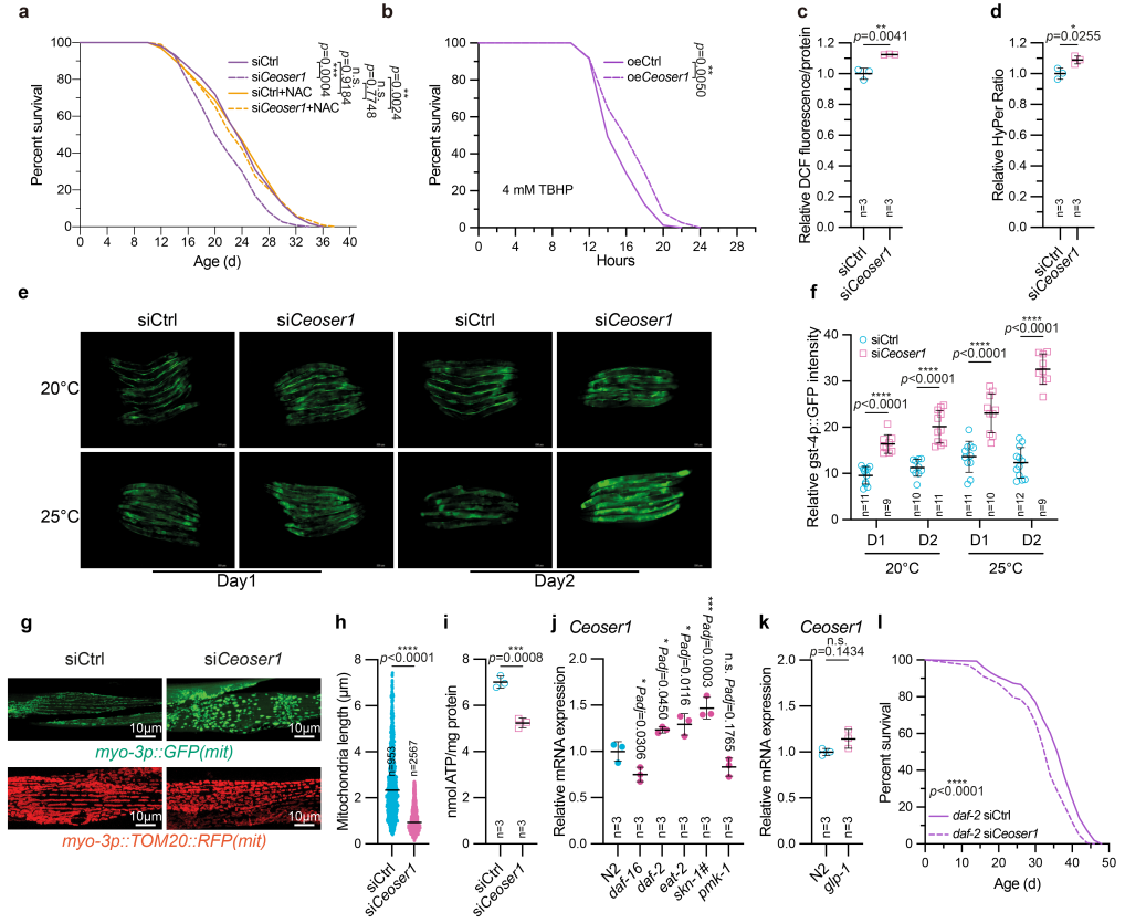 在线虫中,对干涉Ceoser1的实验组同时添加抗氧化剂N-乙酰半胱氨酸(N-Acetyl Cysteine, NAC),则线虫寿命缩短程度显著变小(图6a);过表达Ceoser1能够显著提升线虫抵御叔丁基过氧化氢(Tert-butyl hydroperoxide, TBHP)诱导的氧化应激的能力(图6b),而线虫oser1干涉组中氧化损伤程度被显著加重(图6c-f)。为了探索OSER1调控氧化应激的潜在机理,对产生活性氧的主要细胞器线粒体的形态和功能进行了调查,结果表明Ceoser1干涉后,线粒体形态异常,发生了明显断裂(图6g-h),其产生ATP的核心功能也受到了显著抑制(图6i)。利用不同信号路径核心元件(daf-2、eat-2、skn-1、pmk1)的突变体进行调查,结果显示OSER1处于daf-2、eat2、skn-1信号路径的下游;干涉OSER1能够显著缩短daf-2突变体的长寿表型(图6j-l)。