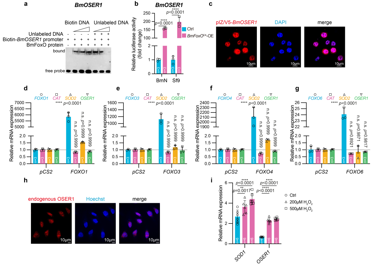 图4. 家蚕和人体内FOXO对OSER1的正向、直接调控作用