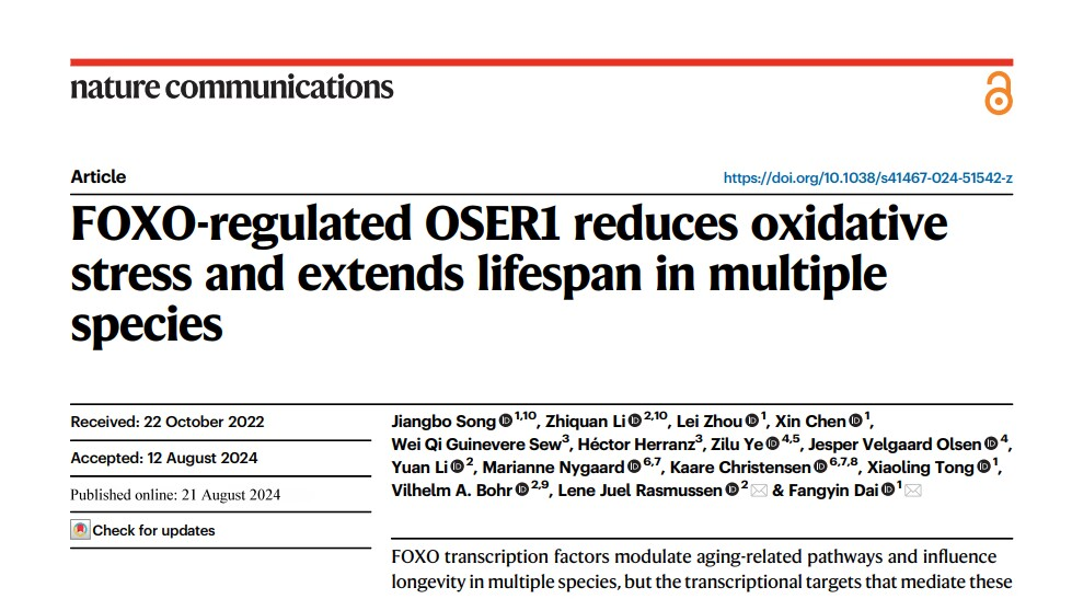 代方银教授团队发现了调控寿命的新基因OSER1,并在家蚕、线虫、果蝇等多物种中研究揭示了其通过提升机体对氧化应激的防御力而延缓衰老和延长寿命的保守性机制,且该基因对寿命的影响得到人类受试者研究结果支持,展示了OSER1作为实现健康衰老和延长寿命的关键调控靶标的重要前景。研究论文“FOXO-regulated OSER1 reduces oxidative stress and extends lifespan in multiple species”已于8月21日在国际知名期刊《自然通讯》(Nature Communications)在线发表。