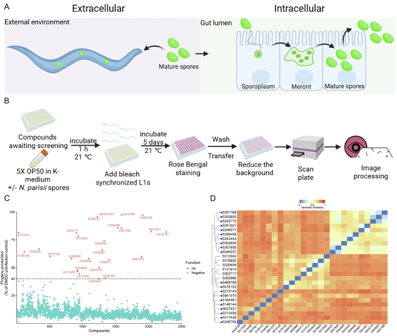 微孢子虫科研团队题为“Small-molecule screen in C. elegans identifies benzenesulfonamides as inhibitors of microsporidia spores”的研究论文。该研究利用秀丽隐杆线虫感染微孢子虫模型进行高通量筛选,从2900余种化合物中筛选获得了21种具有杀灭或抑制微孢子虫作用的化合物,为开发微孢子虫药物提供了重要候选。