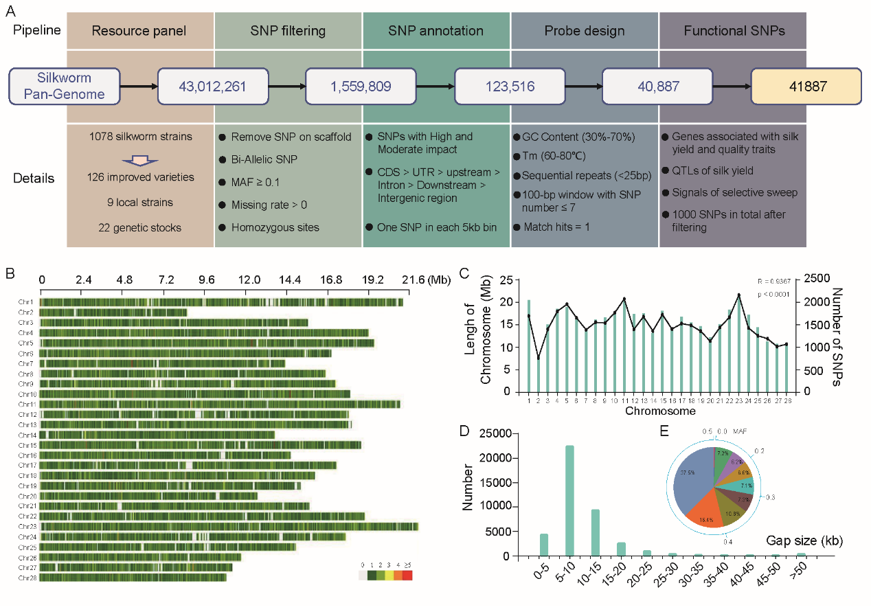 长期以来,家蚕育种以传统的杂交选育及系统分离选择为主,对茧丝产量、品质等复杂育种性状的改良早已进入平台期。突破家蚕育种瓶颈对包括基因组选择在内的先进技术具有根本性依赖,但此前尚缺乏低成本、高通量、高重复性的基因分型工具。为突破这一障碍,研究团队依托前期构建的家蚕超级泛基因组图谱和SilkMeta数据库,精心筛选40,887个覆盖全基因组的代表性SNP为背景位点集,整合包括家蚕茧丝产量关联基因、驯化及育种改良效应基因在内的1000个功能前景位点,成功开发出家蚕首套全基因组SNP育种芯片Silk_40K Array。