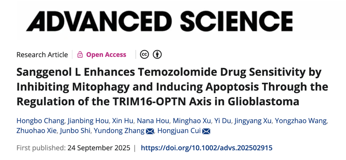 2025924日,iQQtv iQQtv 崔红娟教授课题组在国际top学术期刊《Advanced Science》(中科院1TOP期刊,2024年影响因子IF=14.1)在线发表了题为“Sanggenol L Enhances Temozolomide Drug Sensitivity by Inhibiting Mitophagy and Inducing Apoptosis Through the Regulation of the TRIM16-OPTN Axis in Glioblastoma”的研究成果。该研究首次从桑树活性成分中成功筛选出具有显著抗胶质母细胞瘤活性的天然小分子化合物——桑根醇LSanggenol L,简称SL),并系统揭示了其增强替莫唑胺(Temozolomide,简称TMZ)化疗敏感性的全新作用机制,为胶质母细胞瘤化疗耐药难题提供了关键实验依据与治疗新思路。