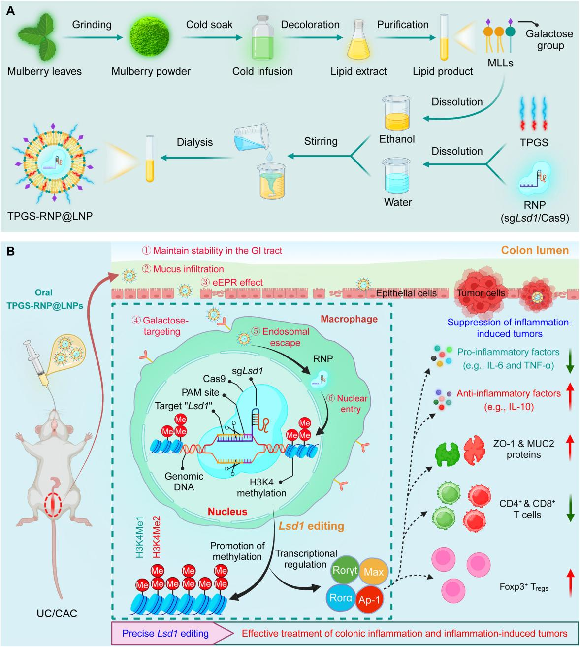 优化的口服递送平台:将靶向 Lsd1的RNP封装进桑叶来源的脂质纳米颗粒(MLLs),并加入FDA批准的稳定剂d-α-生育酚聚乙二醇琥珀酸酯(TPGS)(图1A)。TPGS的引入显著增强了LNP的脂质双分子层稳定性,使其能够在胃肠环境中高效递送RNP,并提高了其穿透结肠黏液屏障的能力。进一步地,TPGS-RNP@LNPs通过上皮细胞增强通透与滞留效应(EPR效应)在炎症结肠组织中富集,并通过半乳糖受体实现对巨噬细胞的特异性靶向。同时,纳米颗粒与内体膜的膜融合机制结合Cas9的核定位信号,确保了RNP的高效核递送。最终,该系统在小鼠中实现了显著的基因编辑效果,并有效缓解了UC和CAC(图1B)。