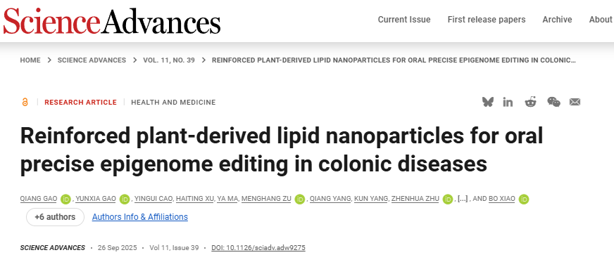 近日,肖波教授、石潇潇副教授团队在国际著名期刊Science Advances(Science子刊)上发表了题为“Reinforced plant- derived lipid nanoparticles for oral precise epigenome editing in colonic diseases”的研究论文。