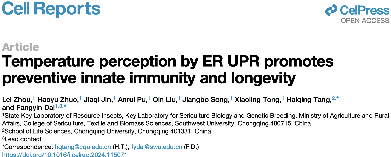 代方银教授团队题为“Temperature perception by ER UPR promotes preventive innate immunity and longevity”(ER UPR介导的温度感知促进预防性先天免疫及长寿)的研究论文,报道了温和高温通过内质网未折叠蛋白反应(ER UPR)激活生物个体的先天免疫反应,并延长寿命的新机制。