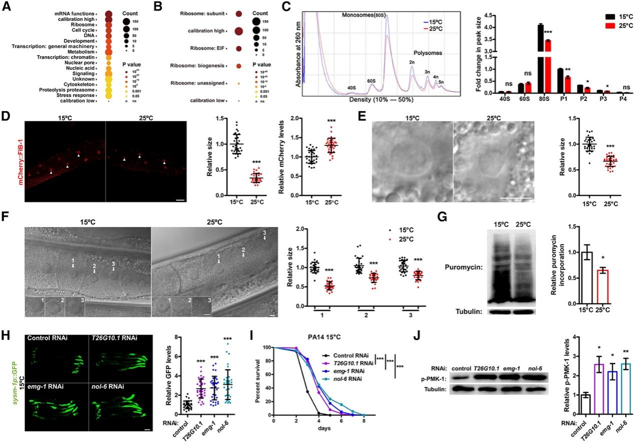 研究还发现,高温显著抑制了核糖体生物合成(Ribosome biogenesis, RiBi)相关基因的表达,且多聚核糖体的生成、核仁的大小和总蛋白质的合成均受到高温的影响,表现为下调趋势。通过RNAi敲低RiBi相关基因(如T26G10.1, emg-1, nol-6),可激活sysm-1p::GFP及PMK-1/p38信号通路,并增强线虫对病原菌的抵抗能力。这表明,抑制RiBi可作为一种免疫激活机制,增强动物的免疫反应。而在温和高温环境中,RiBi及核仁大小受到IRE-1/XBP-1(ER UPR分支)通路的特异性抑制作用,从而提升线虫的先天免疫能力。