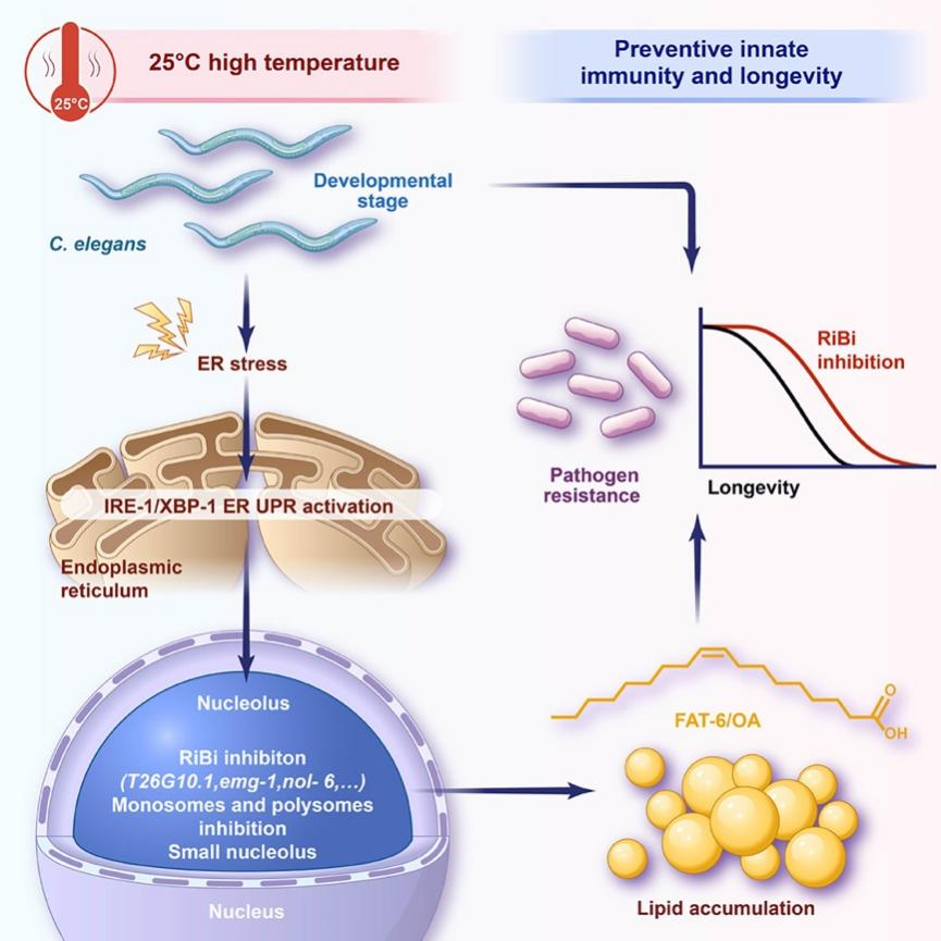 综上所述,发育阶段适度的提高环境温度,会慢性诱发内质网应激,激活内质网未折叠蛋白反应(ER UPR),通过其中的IRE-1/XBP-1通路特异性抑制核糖体生物合成(RiBi),随后引起fat-6增量表达,进而改变脂质代谢,提升先天免疫反应,增强机体对病原菌的抵抗能力,同时延长了寿命。本研究揭示了温和环境高温促进机体预防性先天免疫的分子机制,为理解免疫系统如何适应环境变化提供了新的见解。
