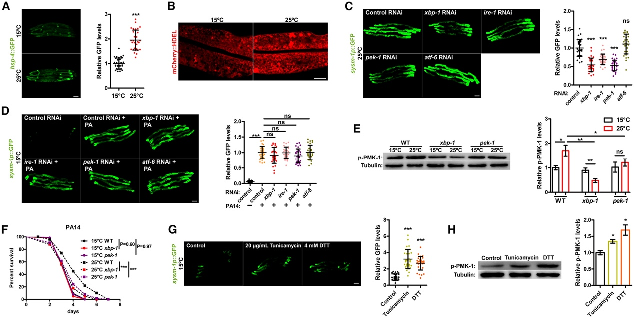 本研究发现,在环境温度升高至25°C时,秀丽隐杆线虫(C. elegans)的ER UPR被激活(线虫的适宜生存温度范围为15°C-25°C),内质网(ER)的形态发生改变,进而通过PMK-1/p38启动免疫反应。利用RNA干扰(RNAi)敲低ER UPR的相关基因(如xbp-1, ire-1, pek-1),高温提升的免疫反应被显著削弱,表明ER UPR在高温诱导的预防性免疫反应中发挥重要作用。与病原菌通过线粒体未折叠蛋白反应激活免疫反应不同,高温对免疫能力的提升依赖于ER UPR。在非高温环境下,添加低剂量诱导药物(衣霉素)慢性激活ER UPR同样可激活免疫报告因子sysm-1p::GFP及PMK-1/p38信号通路。由此表明,ER UPR的慢性激活既是高温下启动预防性免疫反应的必要条件,也是充分条件。