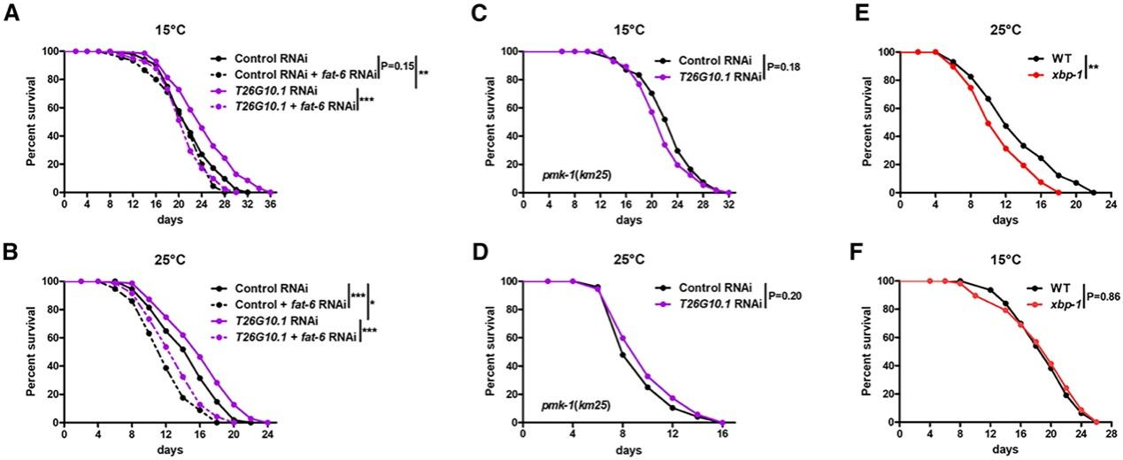本研究还发现,通过T26G10.1 RNAi抑制RiBi,能够延长线虫的寿命,尤其在低温下效果更为明显。然而,抑制RiBi对寿命的延长作用能够被fat-6 RNAi或pmk-1突变所消除,表明RiBi介导的寿命调控依赖于脂质代谢和先天免疫反应。此外,XBP-1在高温下对寿命具有保护作用,xbp-1突变显著缩短了高温环境下线虫的寿命。