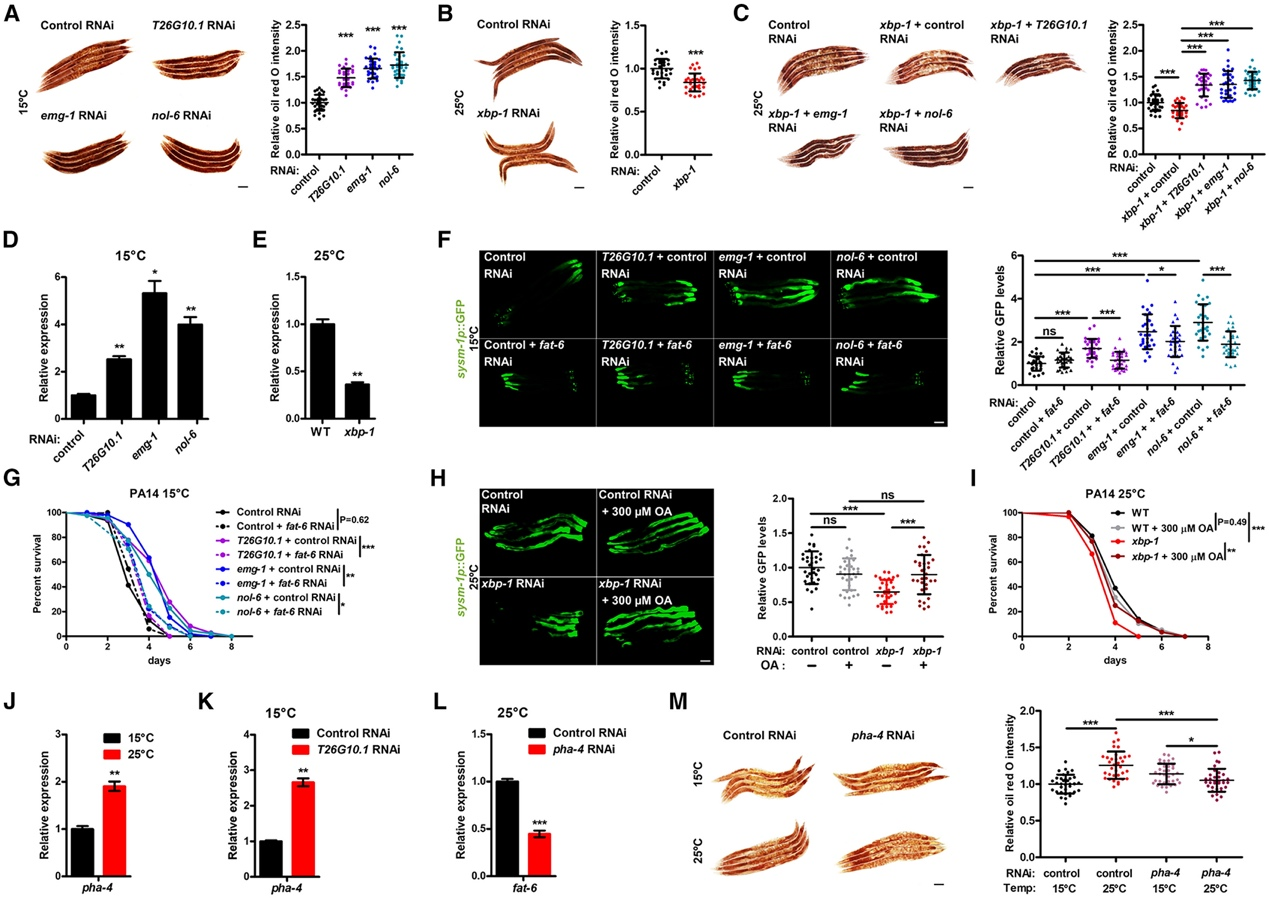 RiBi是细胞内的一个高耗能过程,本研究中,抑制RiBi引起脂质积累;对ER UPR关键基因xbp-1实施RNAi,显著减弱了高温下的脂质积累,但敲低RiBi相关基因逆转了这一效应。这表明ER UPR参与了RiBi在高温下对脂质的积累。进一步研究发现,ER UPR/RiBi通过Δ9脂肪酸去饱和酶FAT-6及其产物油酸(OA)参与高温对免疫反应的激活。此外,转录因子PHA-4被发现在高温对RiBi抑制引发的脂质积累和fat-6的表达中发挥重要作用。