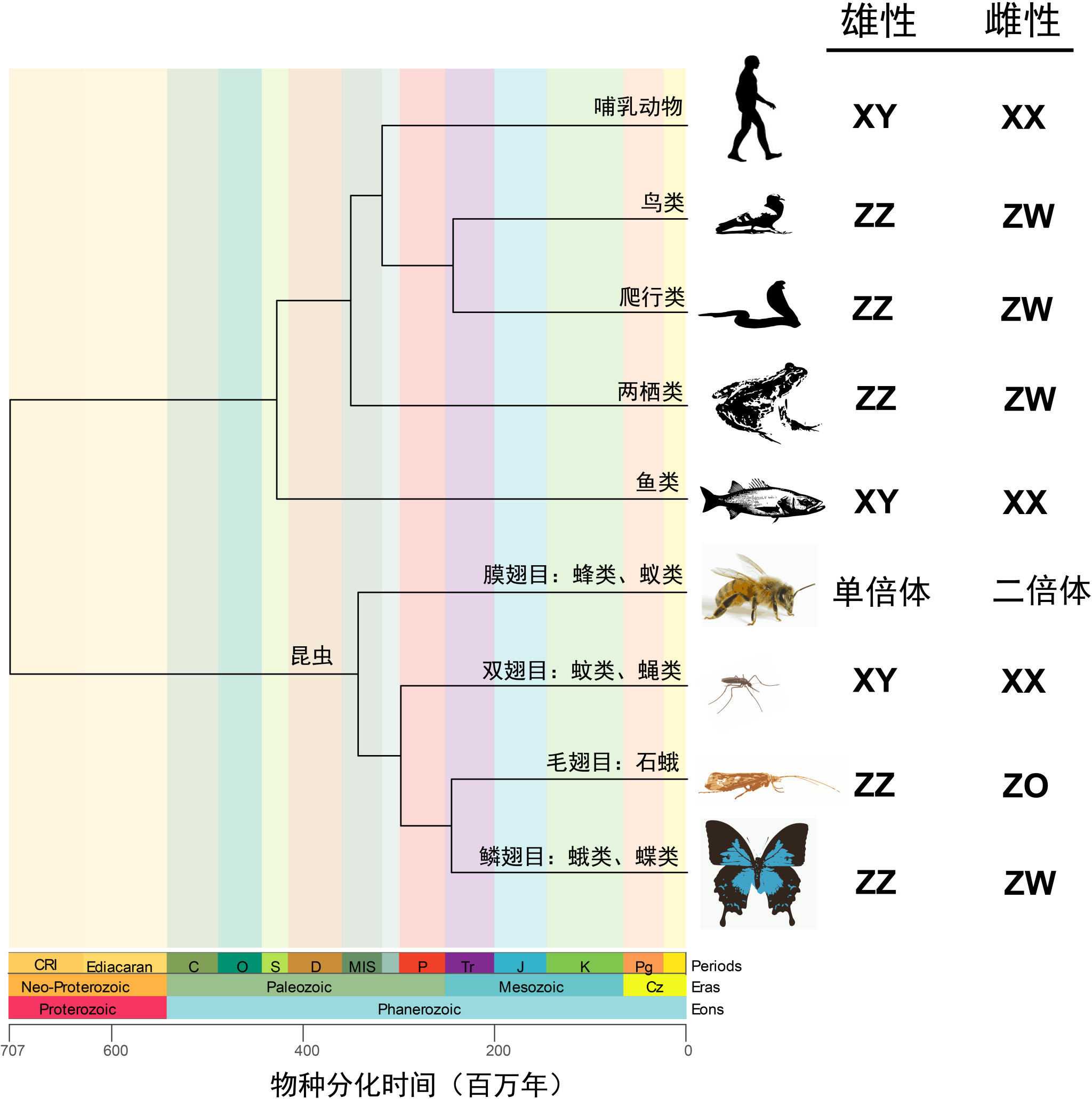 注:上述所列不同类别生物的性染色体组成代表的是该类物种中大部分物种所呈现的性染色体组合。例如,鱼类除了XX/XY系统外,还有一些鱼类属于ZZ/ZW,ZZ/ZO或XX/XO系统。另外,生物界已知性染色体组成的动物以XY/XX系统为主。