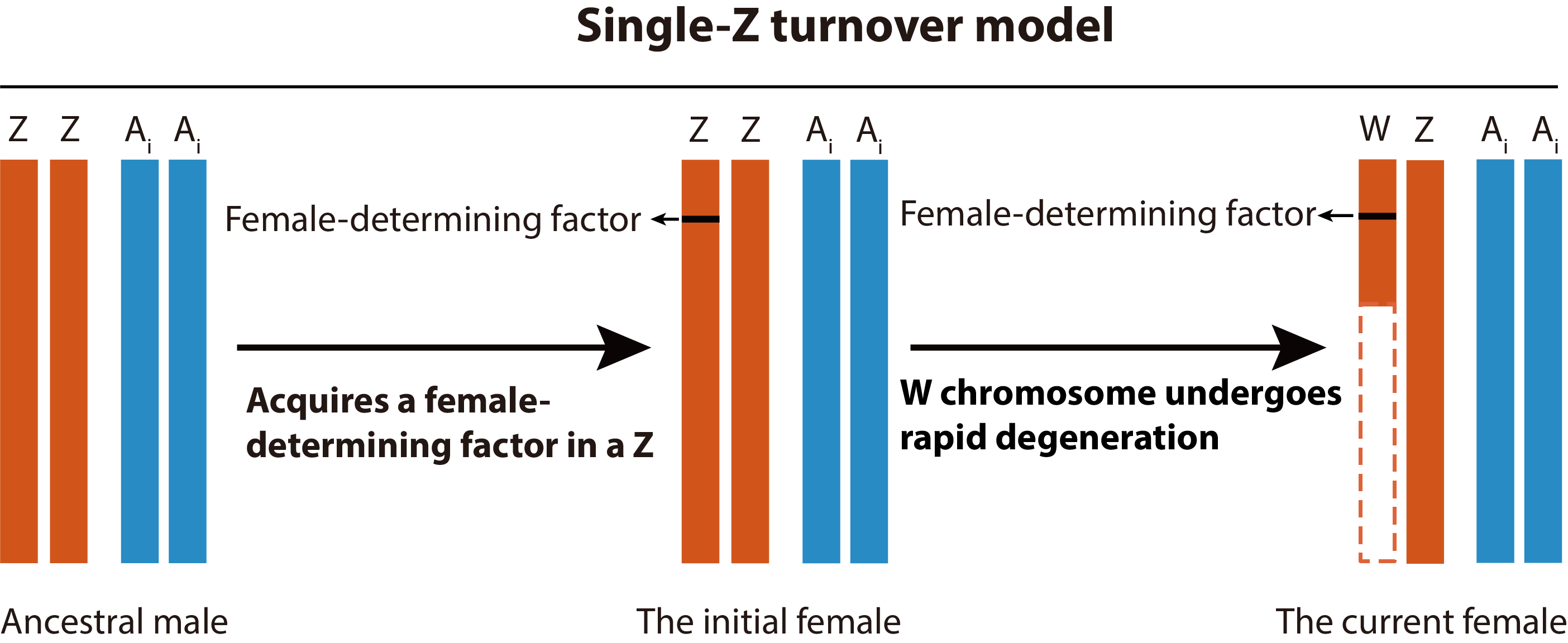 本研究通过比较21个鳞翅目昆虫(包括17个ZW系统,4个ZO系统)和3个毛翅目昆虫(ZO系统)基因组,发现鳞翅目W染色体通过多种机制产生,包括先前推测的非经典模型(Recruitment of B chromosome)、经典模型下的Z-常染色体融合机制(Z-Autosome fusion)和本研究新提出的单个Z染色体转换机制(Single-Z turnover)。本研究发现17个ZW系统中,有3个物种的W染色体形成涉及单个Z染色体转换机制,该机制认为祖先ZO/ZZ性染色体系统中的雄性包含一对ZZ性染色体,在进化过程中其中一条Z染色体获得了雌性性别决定因子,进而导致该Z染色体转变成W染色体。
