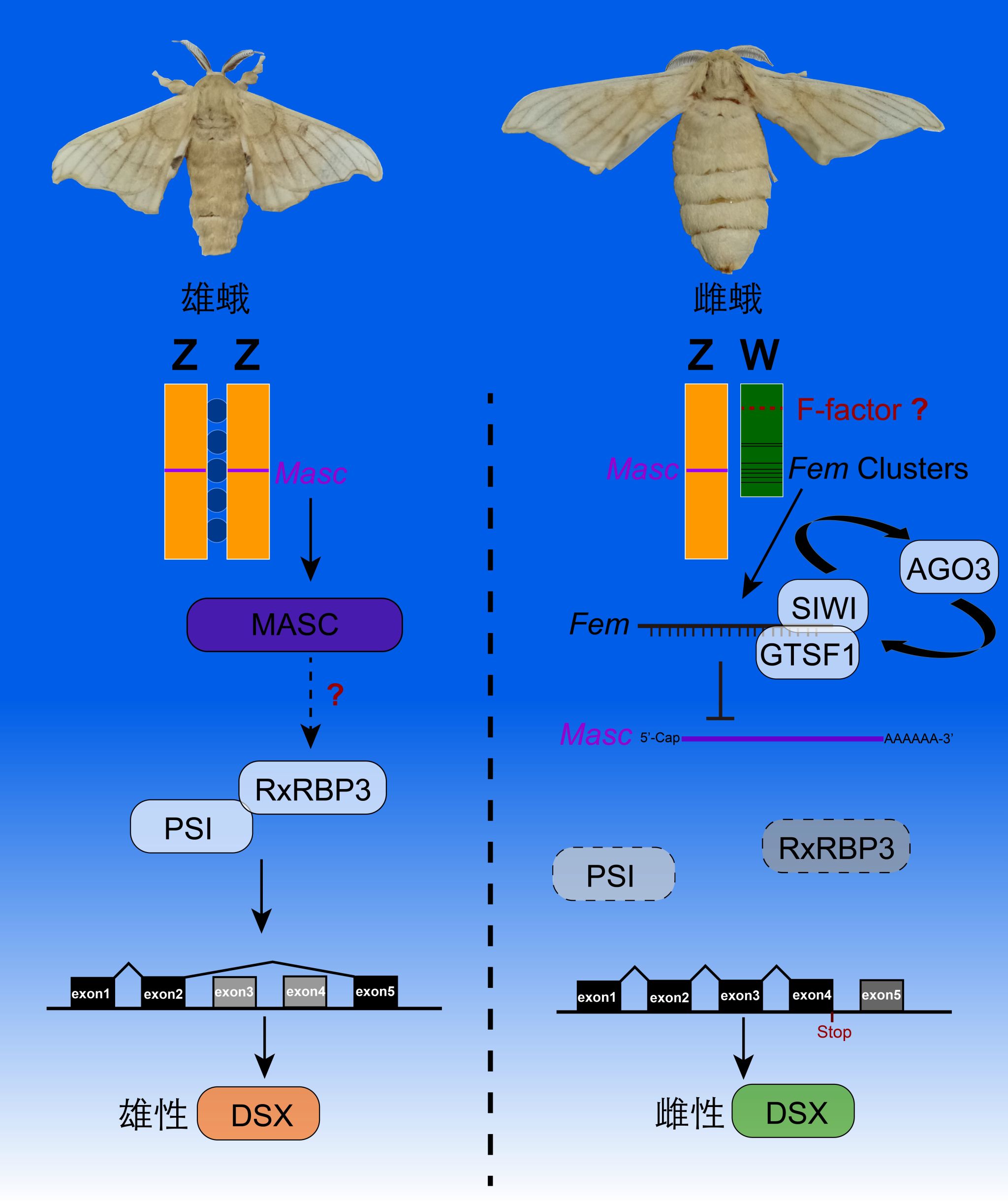 1916年日本学者Yoshimaro Tanaka首次在家蚕中发现W染色体,其后家蚕性别决定的经典遗传研究得到重要发展,并基于W染色体的雌性决定作用,通过诱变技术建立了家蚕性别形态标记,至今被广泛应用于家蚕“限性品种”培育。最近20年来,家蚕性别决定分子机制研究一直是热点问题,包括在W染色体上发现了强雌性决定因子Fem(一个piRNA),在Z染色体上发现了Fem下游因子Masc,在常染色上也发现了影响性别的多个基因。但总体上家蚕性别决定机制仍未被清晰解析,这与家蚕W染色体序列信息的缺乏不无关系。