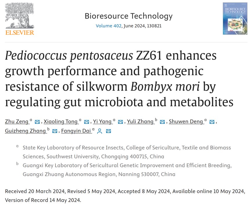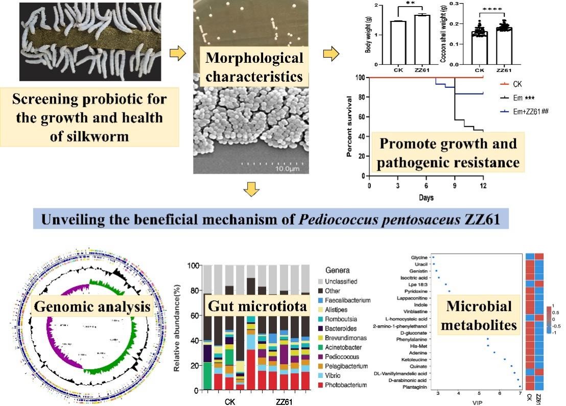 代方银教授团队在环境科学与生态学1区Top期刊Bioresource Technology(影响因子11.4)在线发表题为“Pediococcus pentosaceus ZZ61 enhances growth performance and pathogenic resistance of silkworm Bombyx mori by regulating gut microbiota and metabolites”的论文。该研究筛选到1株能够促进家蚕生长及抗病性能的益生菌戊糖片球菌,揭示该益生菌通过影响家蚕营养代谢、调节肠道微生物和代谢产物,进而促进家蚕生长和健康。研究结果为益生菌与宿主互作机制提供新见解,为家蚕等资源昆虫的健康养殖和病害防治提供了新思路。