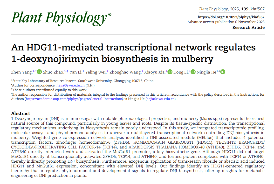 近日,iQQtv 何宁佳团队在桑树特色活性成分1-脱氧野尻霉素(1-deoxynojirimycinDNJ)的生物合成调控研究方面取得重要进展,在中科院期刊分区一区TOP期刊Plant Physiology杂志上以An HDG11-mediated transcriptional network regulates 1-deoxynojirimycin biosynthesis in mulberry”为题发表研究论文。该研究首次成功构建并解析了一个以转录因子HDG11为核心、整合细胞分裂素tZR与脱落酸ABA信号的多层级转录调控网络,系统揭示了桑树DNJ生物合成的关键调控机制,为提升DNJ产量、创制高附加值天然药用资源提供了新的理论支撑和应用方向。