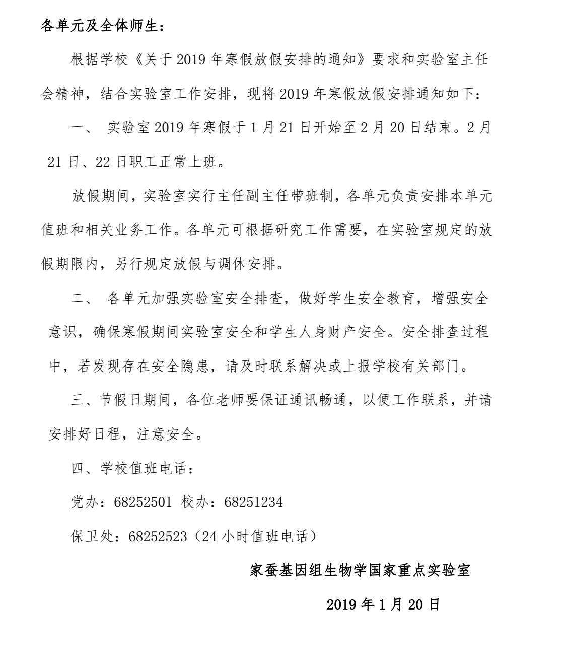 家蚕基因组生物学国家重点iQQtv 关于2019年寒假放假安排的通知