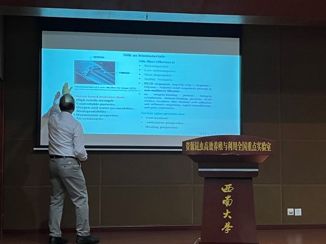 10月26日,Kundu院士在蚕学宫作了题为“Silk Biomaterials for tissue engineering and regenerative medicine”的专题学术报告,围绕蚕丝生物医学材料的优势特点、研究开发、应用现状以及发展趋势等相关问题,与参会师生进行了深入交流和热烈讨论。