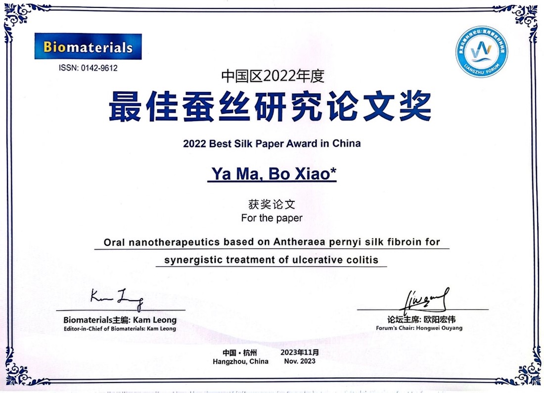 联合国际生物材料领域的四大主流期刊(《Biomaterials》《Advanced Science》《Advanced Healthcare Materials》《ACS Biomaterials Science & Engineering》)主办的“2023良渚尖端科技论坛:医用蚕丝材料科技”,首度发布了中国区2022年度最佳蚕丝论文。肖波教授指导的马雅博士生的学术论文“Oral nanotherapeutics based on Antheraea pernyi silk fibroin for synergistic treatment of ulcerative colitis(ESI高被引论文)”,荣获2022年度Biomaterials中国区最佳蚕丝论文奖。据悉,本次上述4个期刊各自选出1篇最佳论文,共有4篇论文获得表彰。
