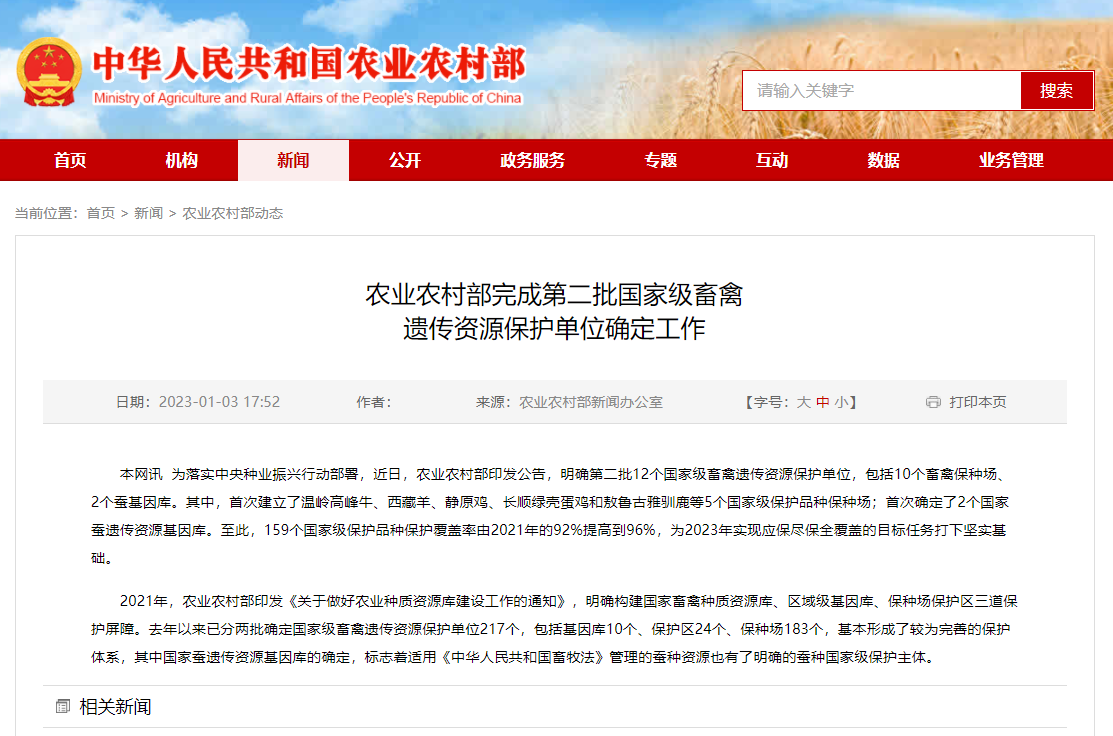 据悉,自2021年农业农村部印发《关于做好农业种质资源库建设工作的通知》以来,已分两批确定了国家级畜禽遗传资源保护单位217个,包括基因库10个、保护区24个、保种场183个,基本形成了较为完善的保护体系。