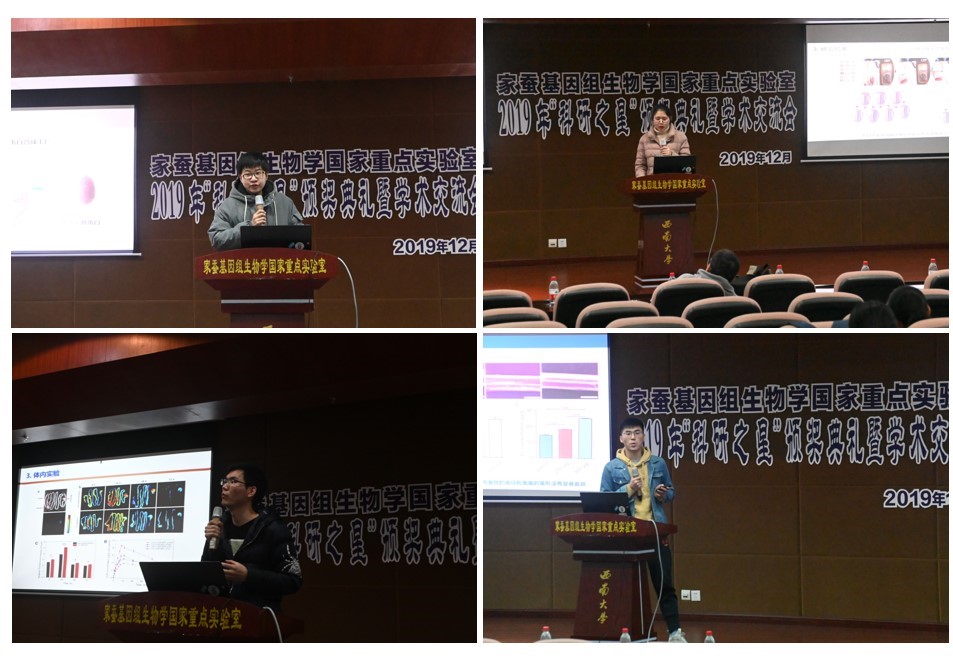 颁奖典礼结束后,部分优秀获奖者代表进行了学术报告交流会。一等奖获得者苟双全同学以 “丝素蛋白——一种完美的药物递送载体材料”为题, 汇报了具有良好生物相容性的天然丝素蛋白可以作为药物递送载体材料。刘青松同学汇报了“利用铁离子改善蚕丝纤维的力学性能”,发现铁离子可增加蚕丝强度和韧性,为蚕丝纤维力学性能的进一步改良和拓宽蚕丝纤维的应用前景奠定了良好的基础。王鹏同学汇报了“基于Shiff's base反应的纤维素增塑丝胶材料的制备及生物学功能研究”,首次通过Shiff's base将双醛羧甲基纤维素应用于丝胶蛋白改性,拓展了其在生物材料领域的应用潜能。倪文佳同学汇报了Hemocytin蛋白在家蚕应答微孢子虫感染中的免疫功能。十三个学术报告精彩纷呈,充分展示了科研之星的学术风采,同学们的汇报得到了老师的肯定和现场精彩点评,并指出了未来可继续深入研究的方向,令报告人和现场的听众都受益匪浅。