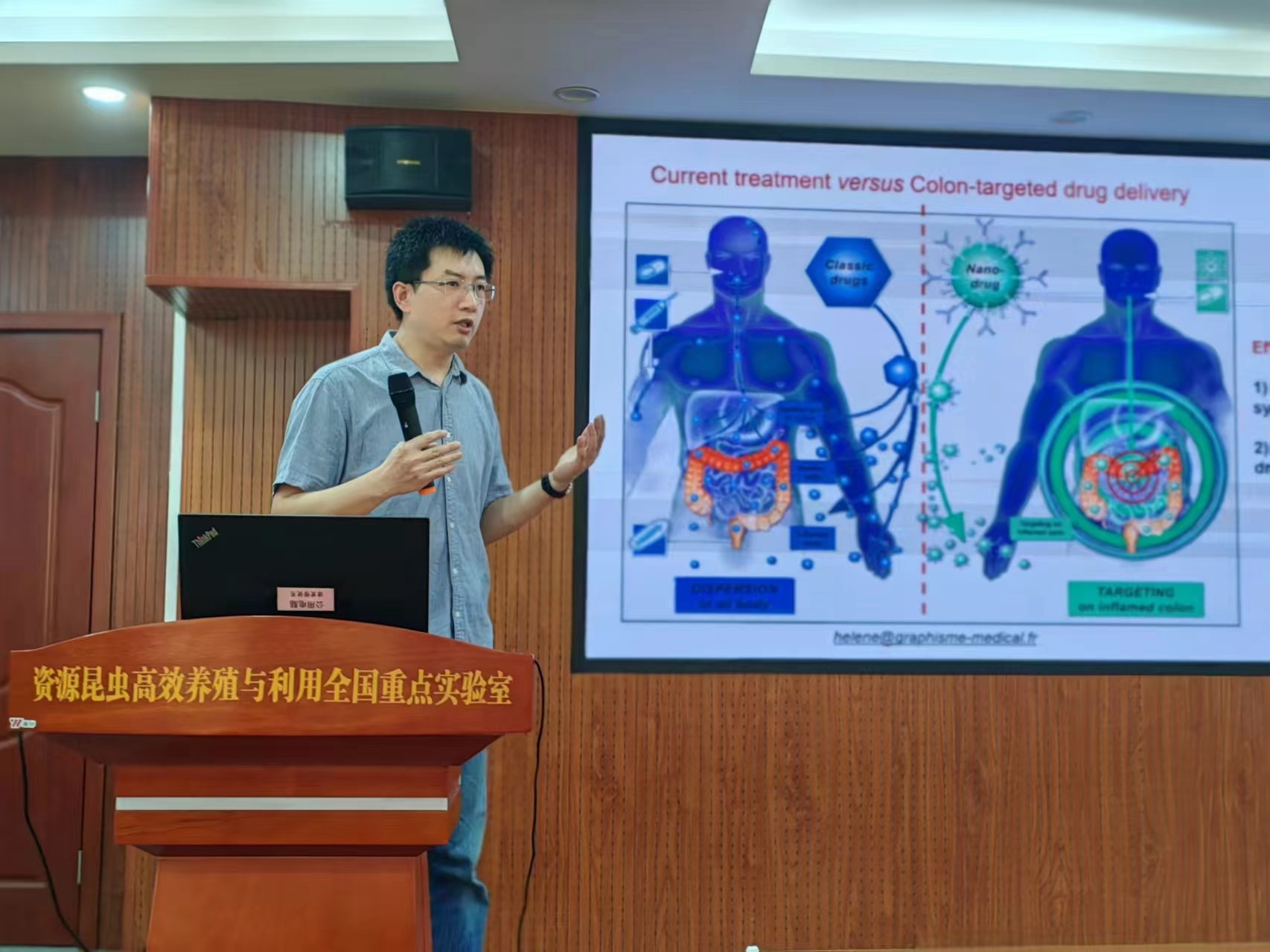 在科技楼四楼报告厅举行了杨春华博士专题学术报告会。学术报告会由韩民锦副教授主持,杨春华博士以“溃疡性结肠炎的靶向口服制剂研发”为题,详细介绍了溃疡性结肠炎的发病机制、口服制剂开发及治疗研究现状、新型制剂的临床应用前景等内容。与在场师生围绕结肠炎治疗所面临的技术挑战、现有治疗方法的局限性与解决方案、蚕丝蛋白在结肠炎治疗中的应用优势等问题,进行了深入的交流和讨论。杨博士还分享了他的学术研究经历以及其制备的天然植物来源的纳米药物递送系统开发进展情况。