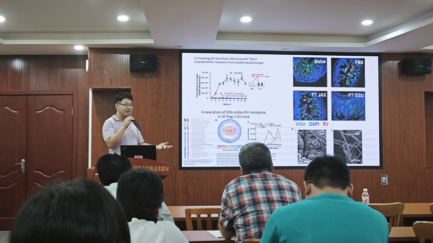 在科技楼四楼学术报告厅举办了石振达博士专场学术报告会。学术报告会由龙定沛副教授主持,石博士以“The Modulations of Microbiota on Rotavirus and Vaccines”(宿主微生物群对轮状病毒感染及相关疫苗的免疫调控作用)为题,介绍了他在美国学习和工作期间,围绕人类肠道微生物、轮状病毒和宿主之间相互作用关系开展的一系列研究和取得的进展。石博士致力于探究肠道细菌如何通过抑制病毒感染和调节疫苗接种,进而开发出抗病毒疾病的新策略。石博士讲解了其课题组如何通过识别新的治疗蛋白或多肽,实现预防和治愈轮状病毒感染,并提高轮状病毒和流感疫苗在各种小鼠模型中的效力。石博士介绍称,他所在的美国疾病预防控制中心课题组正在寻求理解细菌对轮状病毒感染和疫苗接种的抑制效应的更深层次机制,以推动抗轮状病毒和其他病毒如呼吸道感染病毒的疫苗开发。石博士与在场师生围绕基于宿主微生物群的肠道疾病检测与治疗工作的发展方向、基于纳米药物递送载体的病毒疫苗的开发研究等问题,进行了深入的交流和讨论,会议现场氛围热烈。