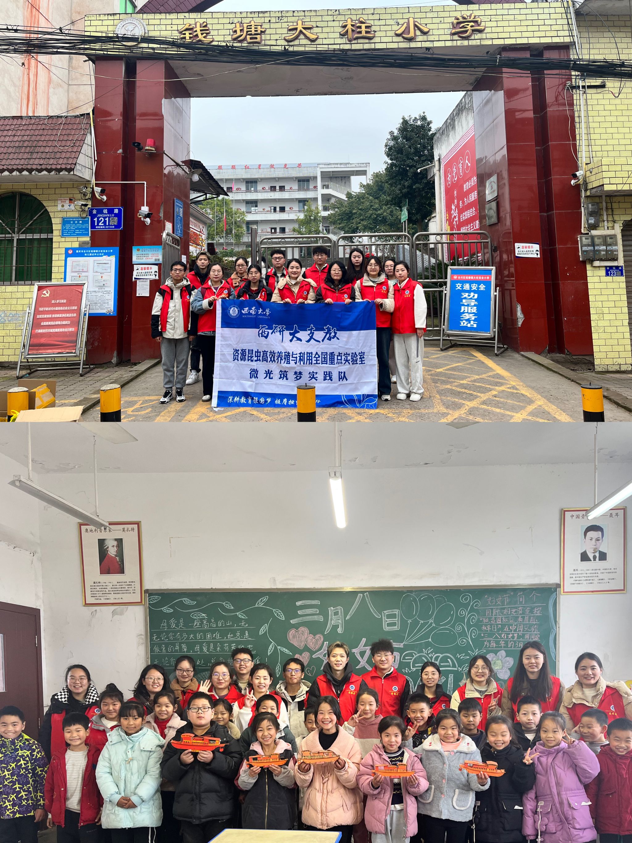 辅导员蔡晓霞老师带领 “微光筑梦”社会实践服务队于2025年2月24日上午八点赴重庆市合川区钱塘镇大柱小学开展为期一天的志愿支教和家访活动。本次活动以“青春不以山海为远 志愿只向国家未来”为主题,旨在将高校优质教育资源辐射至乡村,为乡村儿童点亮梦想,为国家未来播种希望。