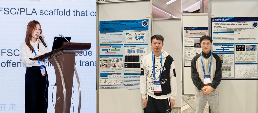 在学术交流环节,博士生张茜作题为 “Osteoimmunity-Regulating Biospun 3D Silk Scaffold for Bone Regeneration in Critical-size Defects” 的口头报告,聚焦骨免疫调控与丝素三维支架的耦合策略,凭借扎实研究与清晰表达,获分论坛“Best Oral Presentation”奖。博士生刘玉隆与朱思宇完成专题墙报展示,围绕蚕丝材料在组织工程与再生医学中的应用探索展开交流。相关工作呈现了iQQtv