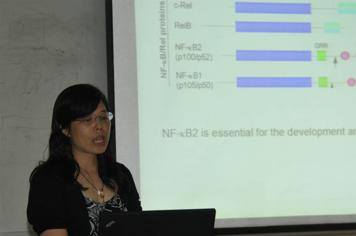 进行为期四天的学术交流。交流期间作了题为“NF-kB2 signaling pathway in the pathogenesis of lymphoma, autoimmune and inflammation disease”的学术报告,重点阐述了NF-kB2蛋白在淋巴瘤、自身免疫性疾病和炎症的发生、发展,为药物研发临床靶标提供了模型和依据。访问期间,杨丽群博士就实验设计及科研方法等与部分青年教师及学生进行了深入交流。报告引起了研究生广泛的兴趣,有效的促进了学生的对癌症研究及其转化研究的兴趣。